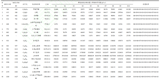 利用電子鼻對(duì)10種不同產(chǎn)地草果樣品進(jìn)行的檢測(cè)分析及后續(xù)數(shù)據(jù)處理,獲得了在MXT-5色譜柱和MXT-1701色譜柱上的氣味指紋圖譜,結(jié)果如圖2、圖3所示,觀察到不同產(chǎn)地草果的氣味成分色譜峰在出峰時(shí)間和峰面積上均呈現(xiàn)出明顯差異。若通過(guò)比對(duì)放大色譜圖來(lái)尋找樣品組間的差異,此過(guò)程較為繁瑣與復(fù)雜。為了提高分析效率,故采用先統(tǒng)計(jì)后化學(xué)分析的方法,首先,通過(guò)PCA法對(duì)不同產(chǎn)地草果樣品的氣味進(jìn)行統(tǒng)計(jì)分析,識(shí)別氣味上的差異。在PCA分析的基礎(chǔ)上,進(jìn)一步確定差異色譜峰。隨后,利用AroChembase數(shù)據(jù)庫(kù)對(duì)這些差異色譜峰進(jìn)行定性分析。