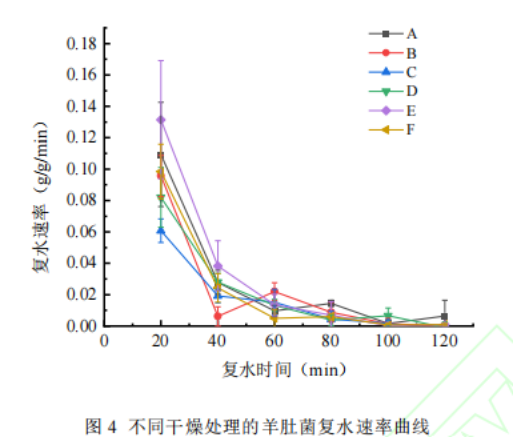 不同干燥處理的羊肚菌干品復(fù)水速率如圖4所示。復(fù)水20min時(shí)的羊肚菌的復(fù)水速率E處理>A處理>F處理>B處理>D處理>C處理,E處理羊肚菌在20min時(shí)復(fù)水速率最高,各處理隨著復(fù)水時(shí)間的延長,復(fù)水速率逐漸降低,F處理羊肚菌在60min時(shí)復(fù)水率最先趨近于0,子實(shí)體的復(fù)水速度最快,80min后各處理組羊肚菌復(fù)水率均趨于0,子實(shí)體的重量不再明顯增加。